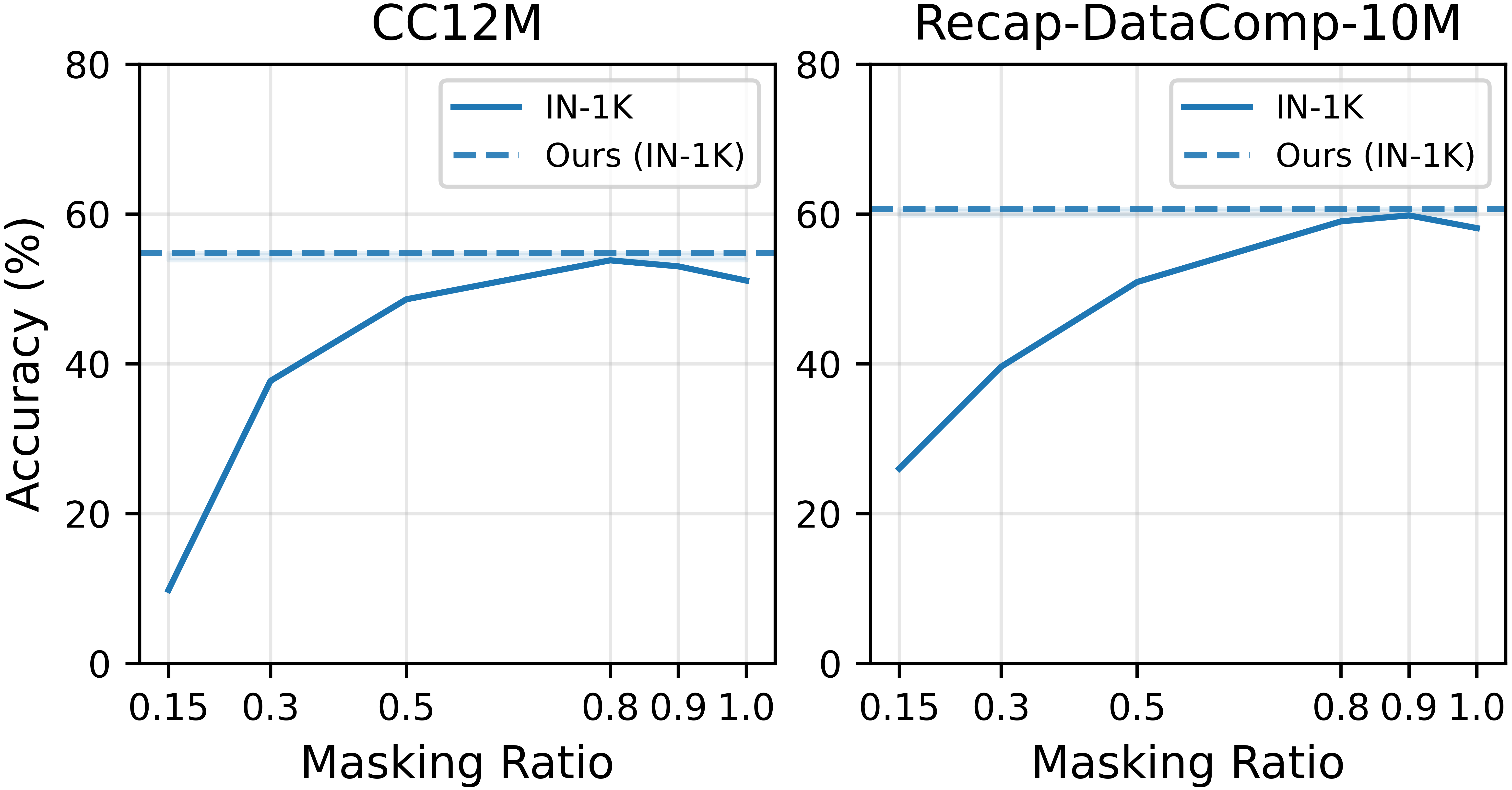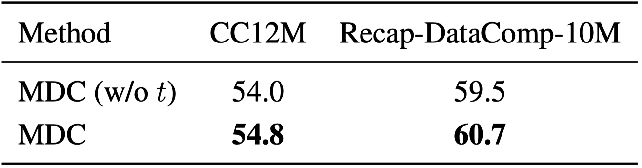 Ablation on $t$. We compare masked diffusion captioning (MDC) with its loss variant pretrained on CC12M and Recap-DataComp-10M. We evaluate them by linear probing on ImageNet-1K.