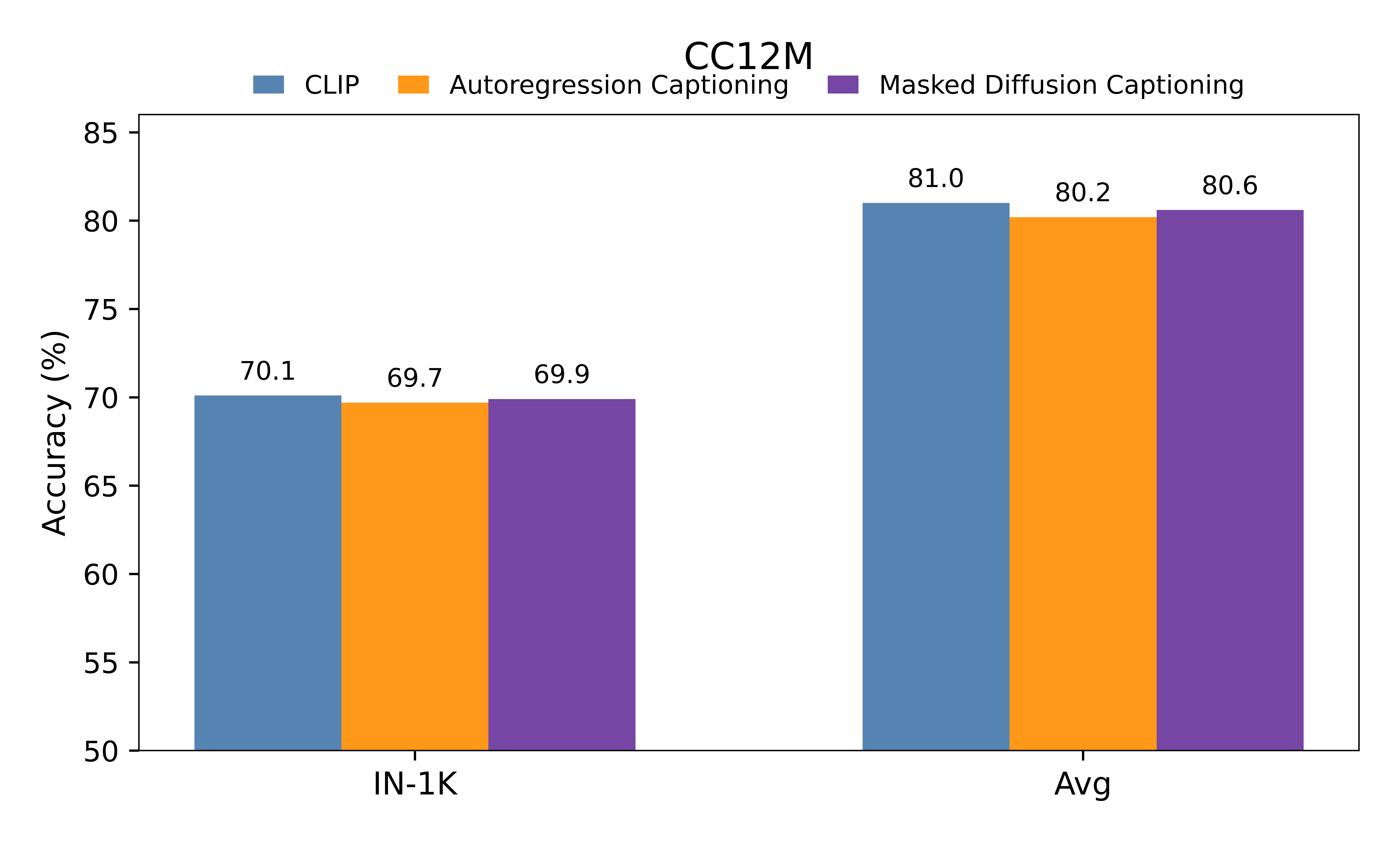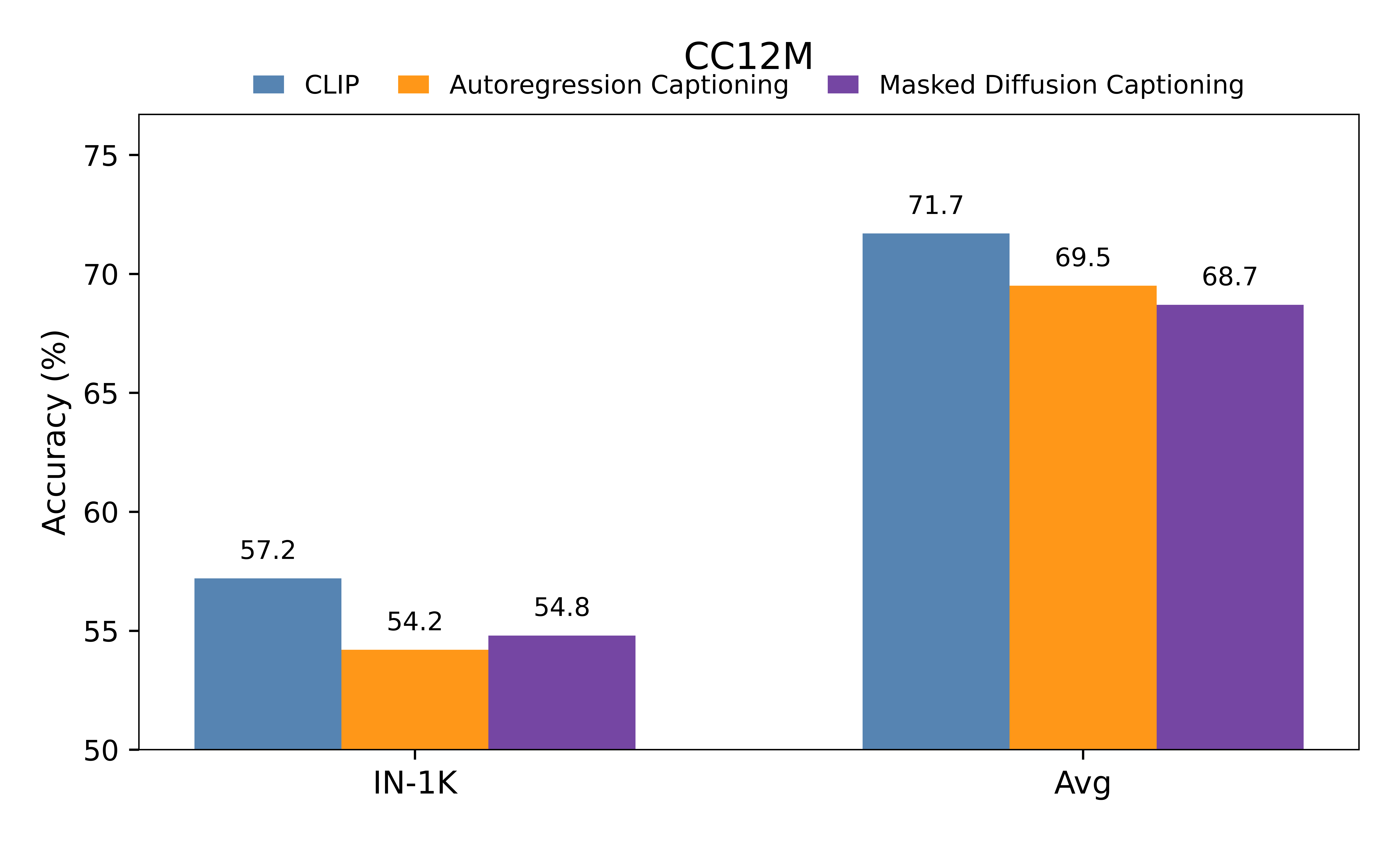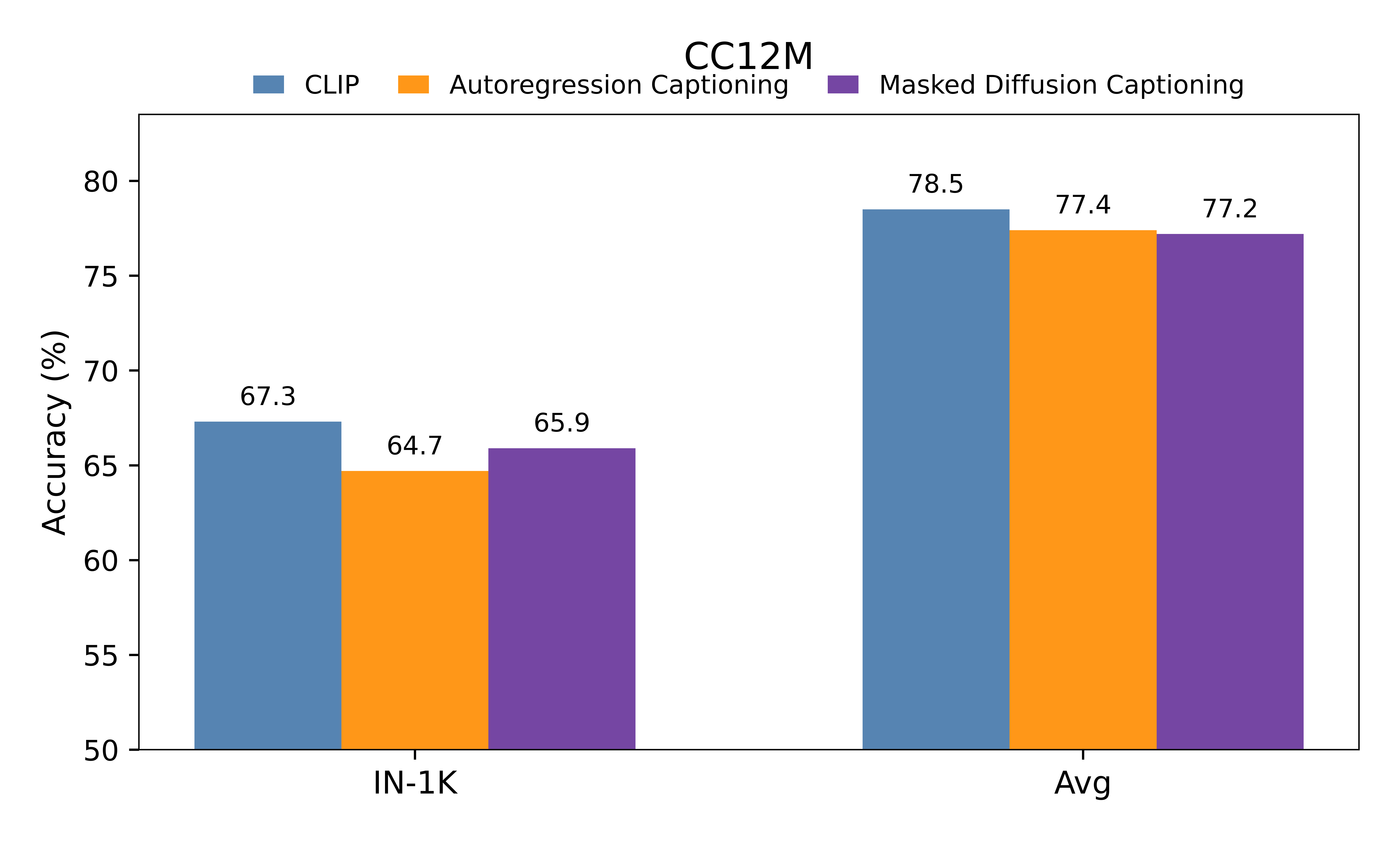 We compare masked diffusion captioning with CLIP and autoregressive captioning with vision backbones of ViT-B/32, ViT-B/16, and ViT-L/14. We choose CC12M and a 10M random subset of Recap-DataComp (Recap-DataComp-10M) as the pretraining datasets. We evaluate the learned visual features by linear probing on several datasets: ImageNet-1K, Foods, CIFAR-10, CIFAR-100, and Pets.
