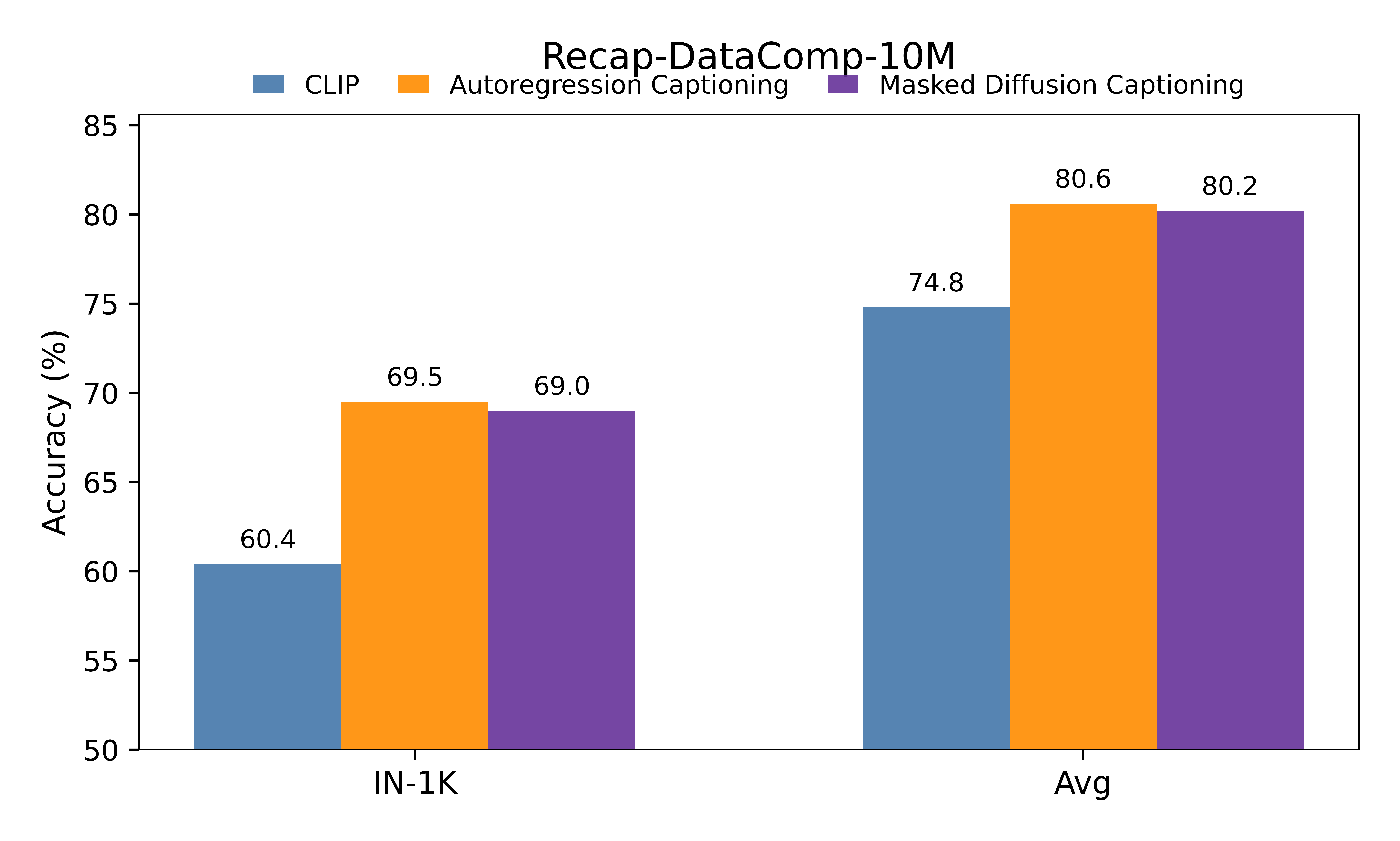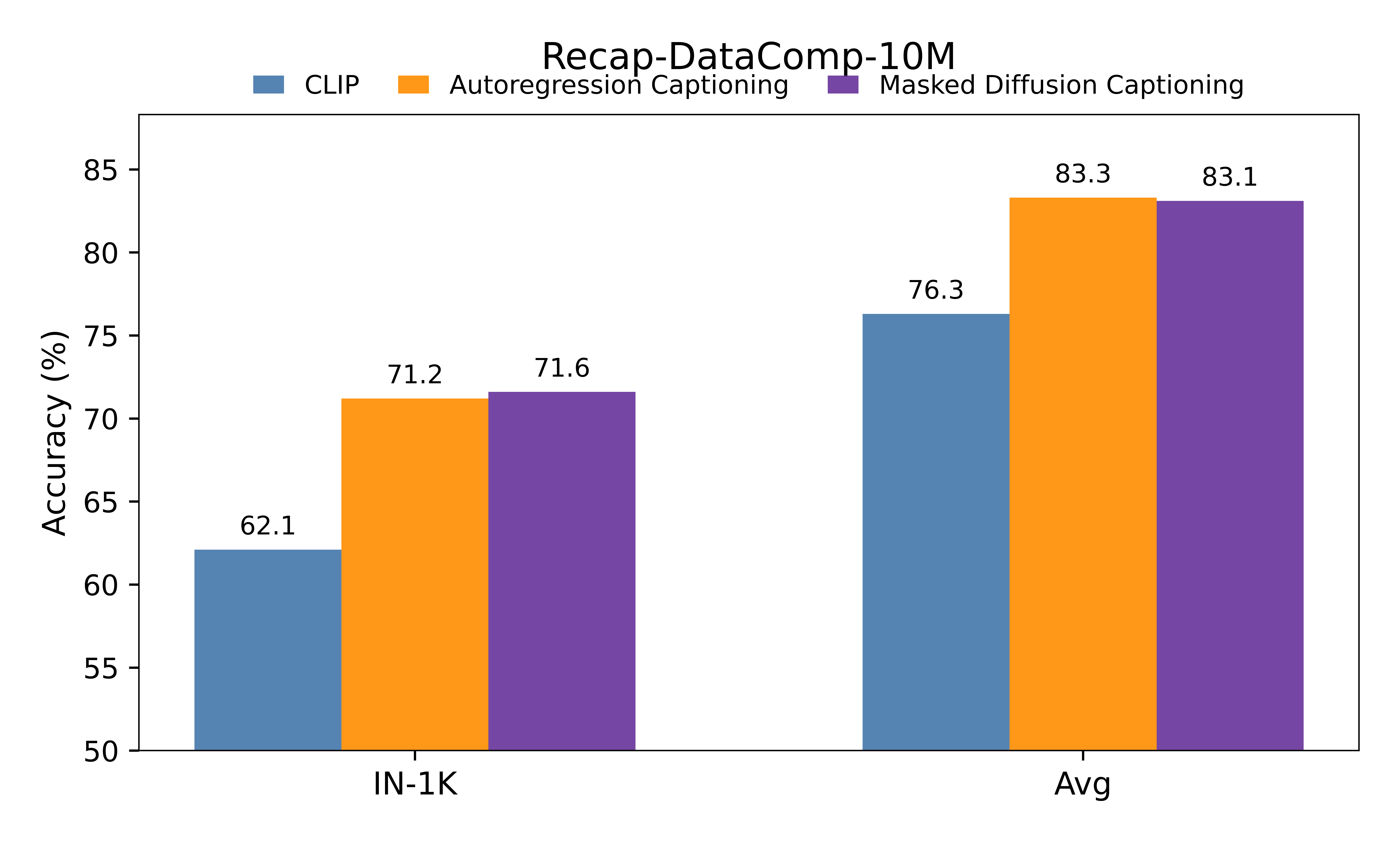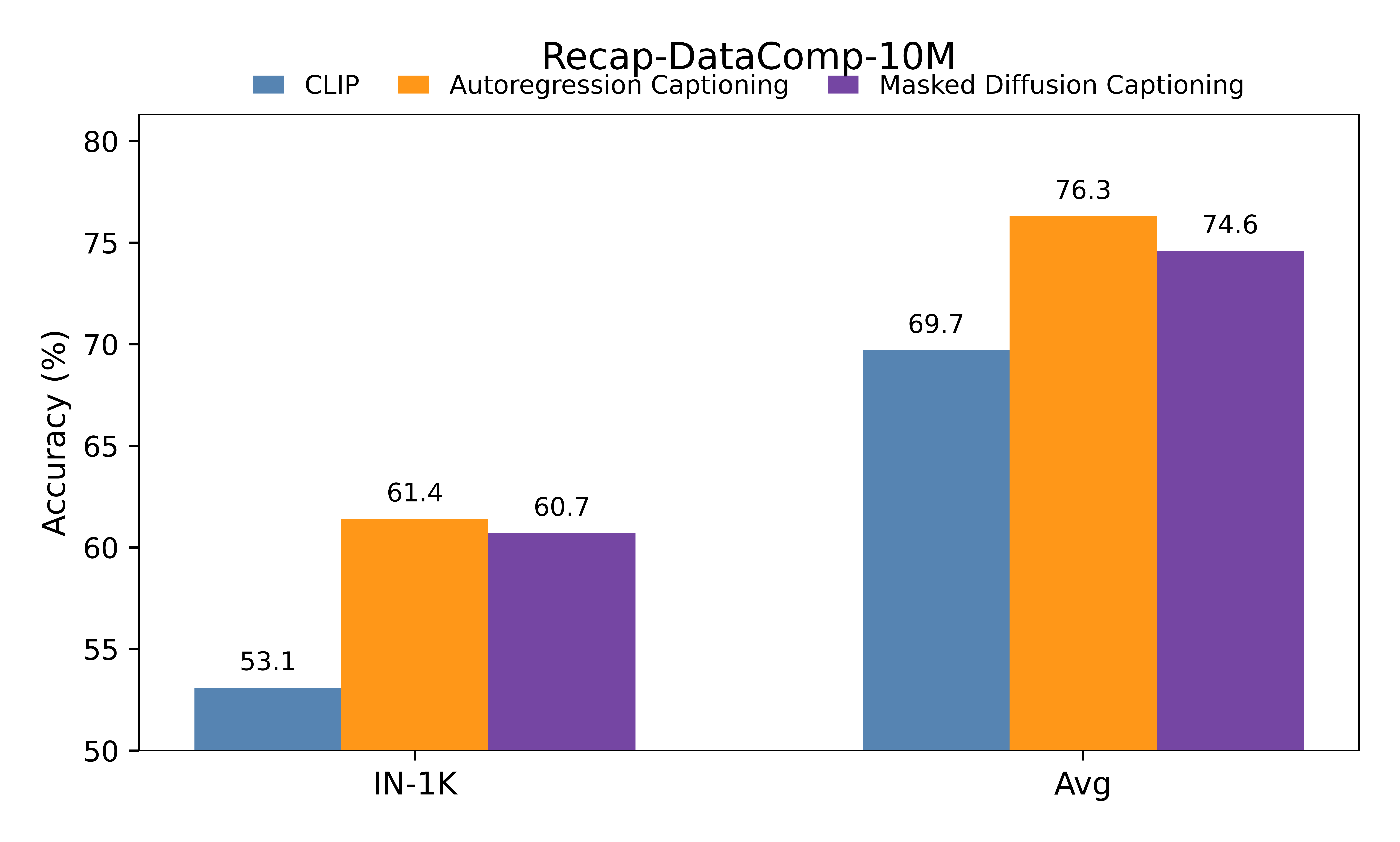 We compare masked diffusion captioning with CLIP and autoregressive captioning with vision backbones of ViT-B/32, ViT-B/16, and ViT-L/14. We choose CC12M and a 10M random subset of Recap-DataComp (Recap-DataComp-10M) as the pretraining datasets. We evaluate the learned visual features by linear probing on several datasets: ImageNet-1K, Foods, CIFAR-10, CIFAR-100, and Pets.