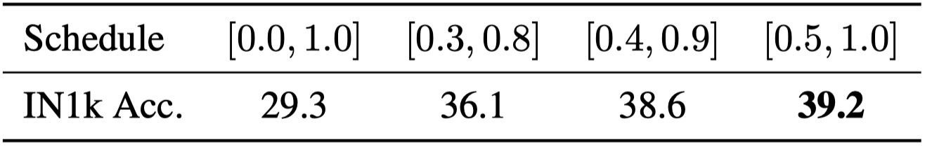 Analysis of noise schedule. We test masked diffusion captioning pretrained on CC3M with different noise schedules by linear probing on ImageNet-1K.