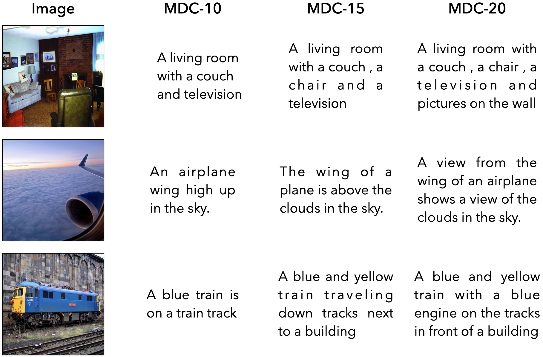 Examples of caption sampling. We show three examples sampled from MSCOCO Karpathy-test split. MDC-10/15/20 means the length of the output sequence is 10/15/20 for masked diffusion captioning.
