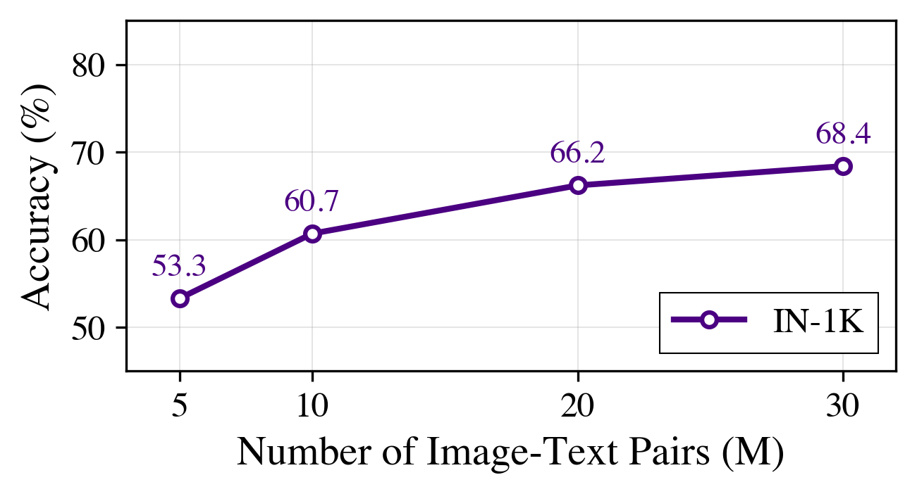 Linear probing performance with varying numbers of image-text pairs. We randomly sample 5M, 10M, 20M, and 30M pairs from Recap-DataComp-1B for pretraining our method. As the number of image-text pairs increases, the linear probing performance on IN-1K improves.