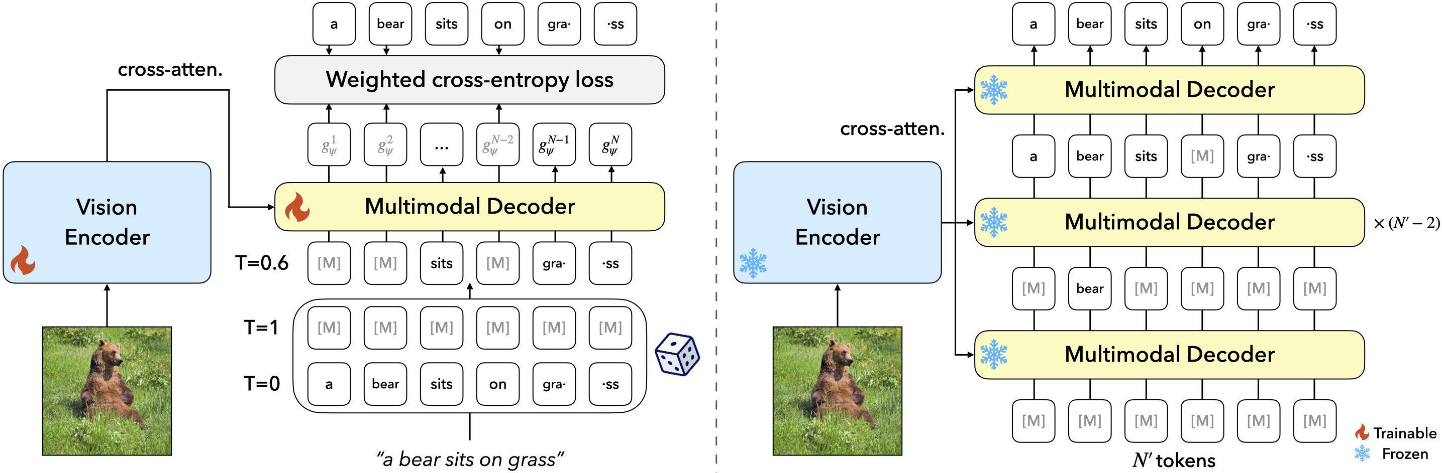 (a) Masked diffusion captioning. (b) Image-conditioned language sampling.