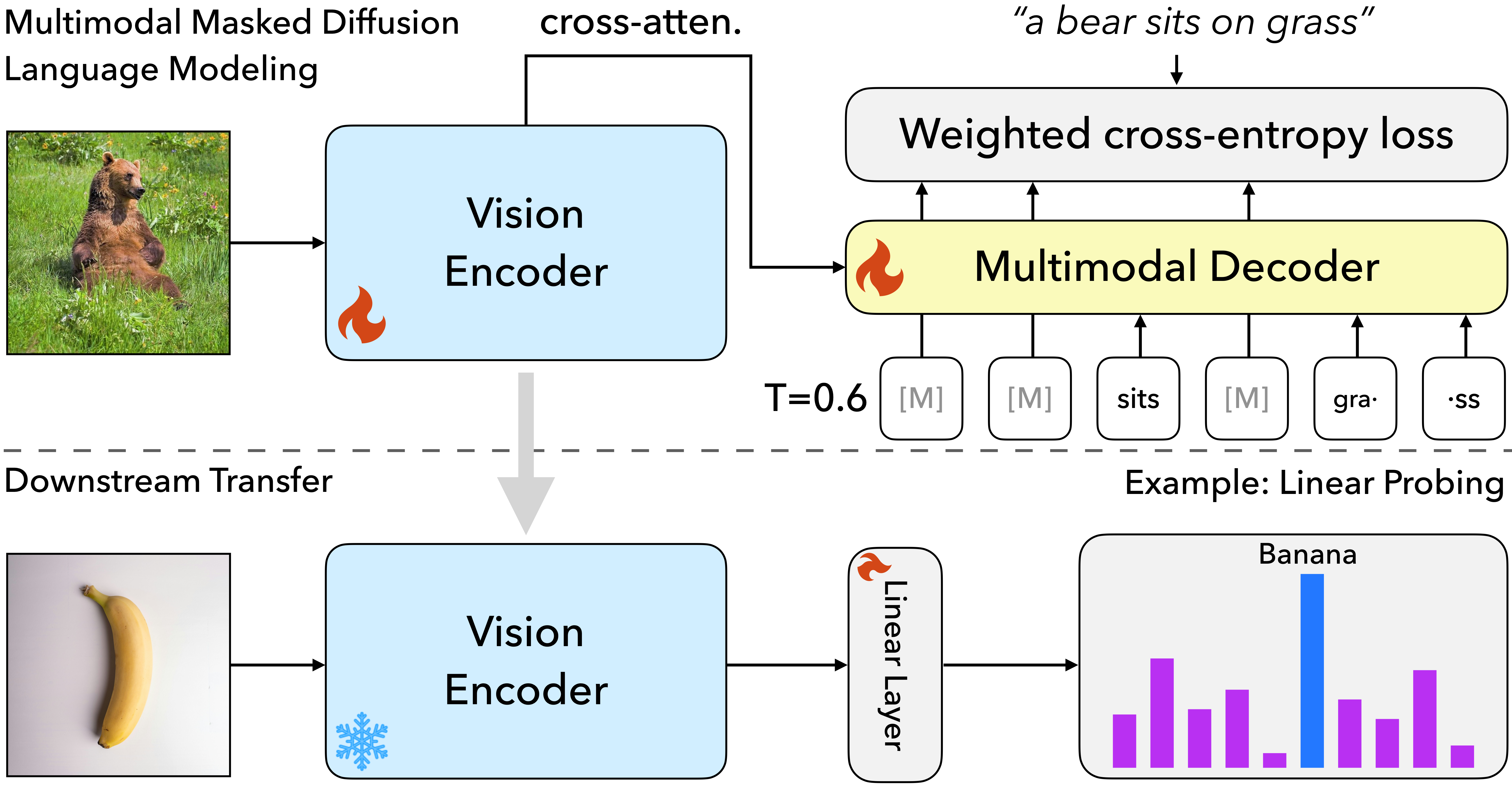We train an image-conditioned masked diffusion language model to learn visual features. Each training pair consists of image $I$ and its corresponding caption $C$. We use a standard transformer encoder-decoder architecture following Tschannen et al. (2023) as the captioner $h$. Encoder $f_{\phi}$ takes image $I$ and produces a sequence of visual features $\mathbf{V}= f_{\phi}(I)$. These are (late) fused with the decoder $g_{\psi}$ by cross attention to predict caption $C$.