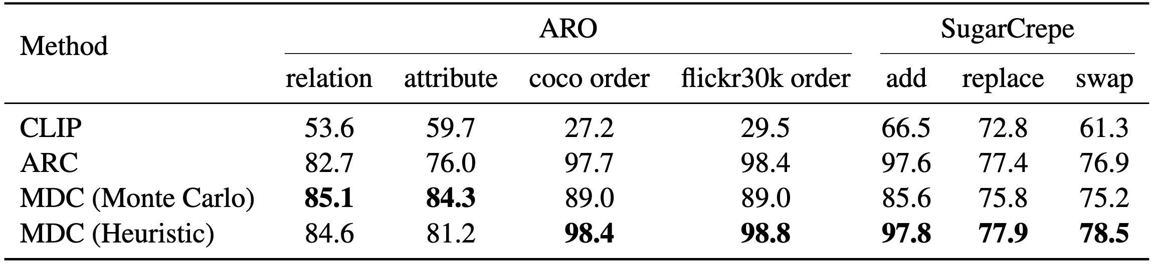 Vision language compositionality evaluation. We evaluate compositionality of models on two benchmarks: ARO (Yuksekgonul et al., 2022) and SugarCrepe (Hsieh et al., 2023).